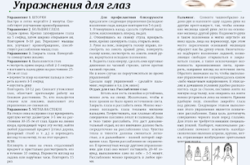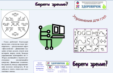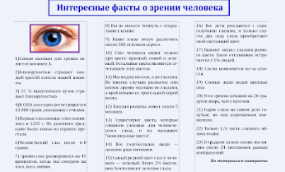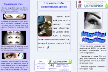 | | Наше зрение в наших руках | 03-10-2016 Юные корреспонденты школьной газеты «Здоровячок» Симонов Денис, Мамедрзаева Хава и Артемьева Оксана подготовили проект «Наше зрение в наших руках», цель которого – привлечь внимание школьников к проблеме хорошего зрения. Они создали буклеты «Интересные факты о зрении человека», «Причины ухудшения зрения», «Береги зрение». Теперь их задача – выступить с этой информацией на классных часах в начальной и средней школе и раздать ученикам эти буклеты.
